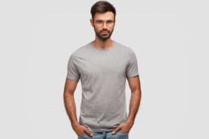 Horizontal portrait of attractive bearded male with serious expression, dressed in casual grey t shirt, keeps hands in pockets, shows new clothes, isolated over white background. People, style concept