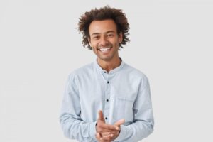 Waist up portrait of cheerful handsome African American male keeps hands together, smiles broadly, dressed in elegant shirt, being in high spirit after date with girlfriend, shares impressions